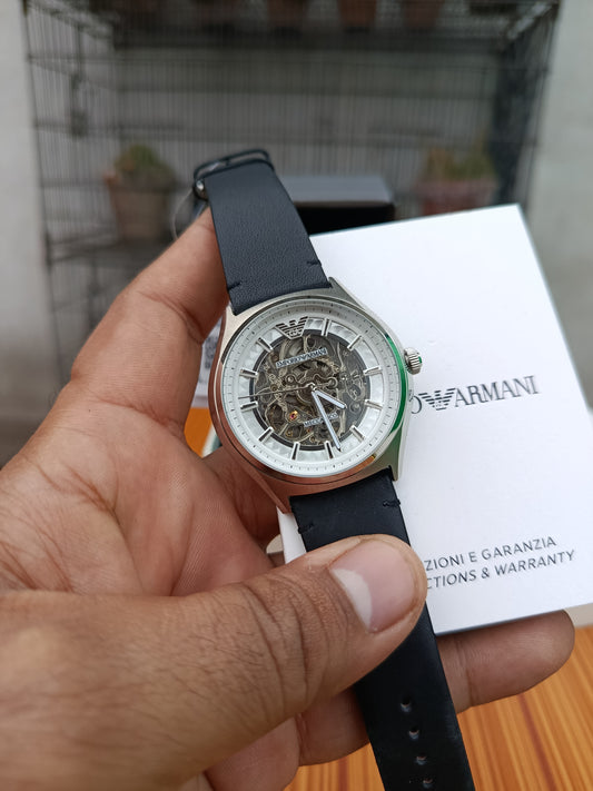 Emporio Armani AR60003 Men’s Automatic Watch | Skeleton Dial Black Leather Strap