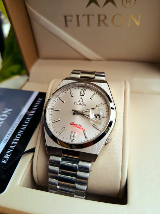 Fitron White Dial Stainless Steel Watch – Japanese Quartz, Sapphire Glass, 41mm Case | Box & Warranty Included