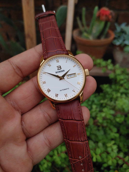 Binger Automatic Leather Strap Wrist Watch For Men White Dial Gold Case