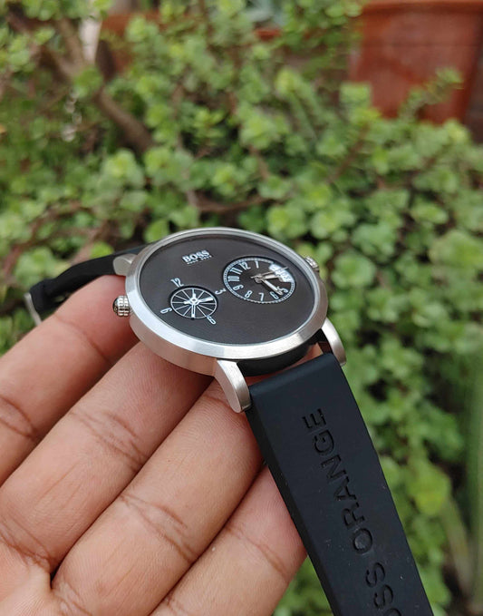 Hugo Boss Slim Dual Time Wrist Watch For Men Stainless Steel Case Rubber Straps