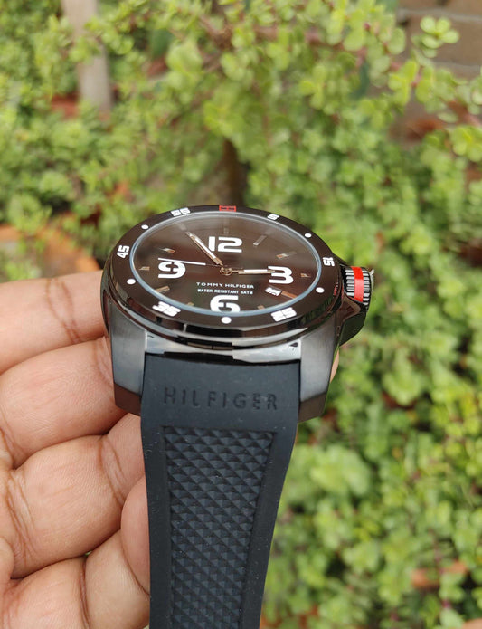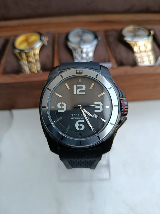 Tommy Hilfiger Black Rubber Strap Sports Watch For Men Solid Steel Case