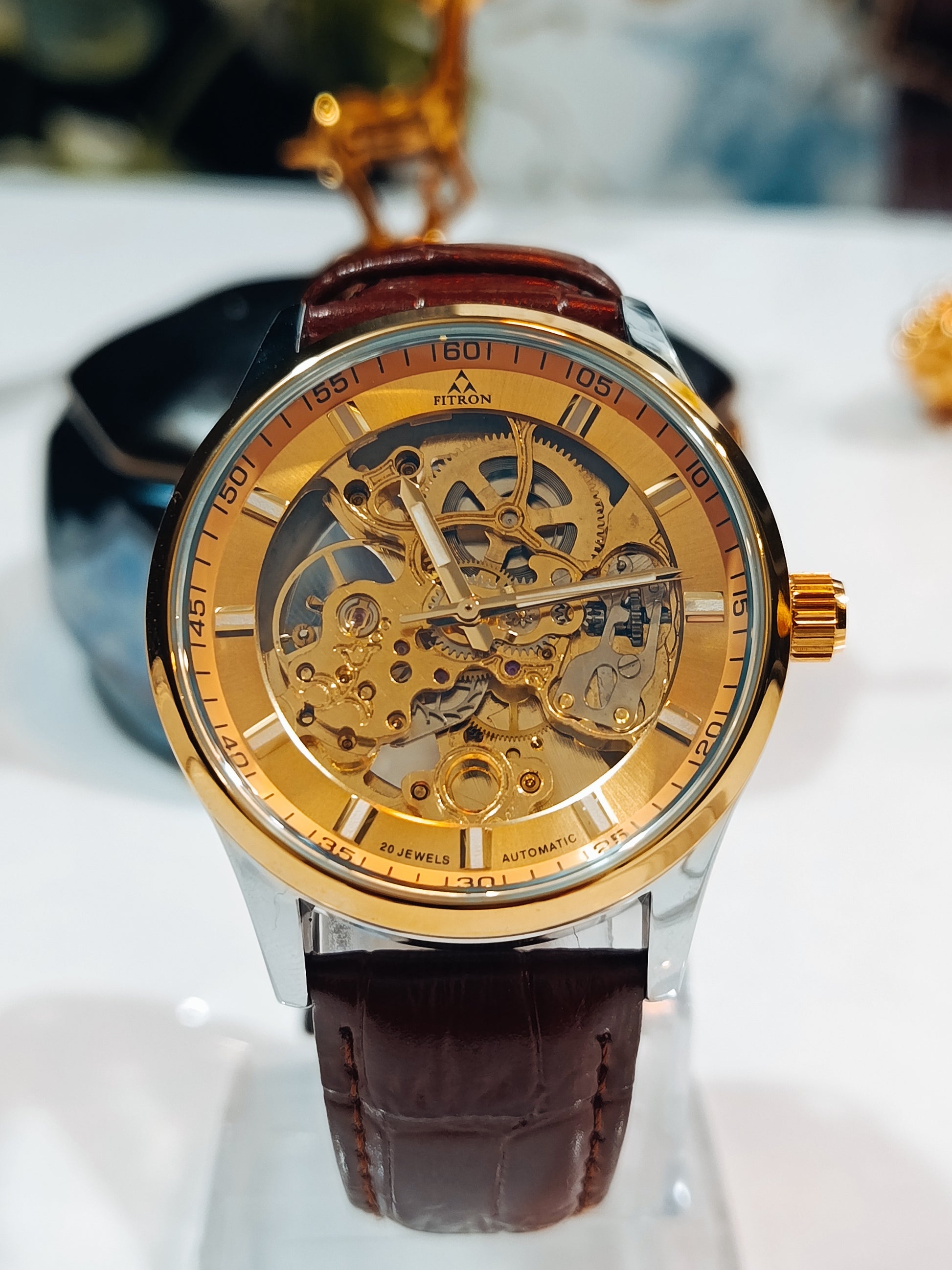 • Skeleton design watch with gold dial and premium brown leather strap.