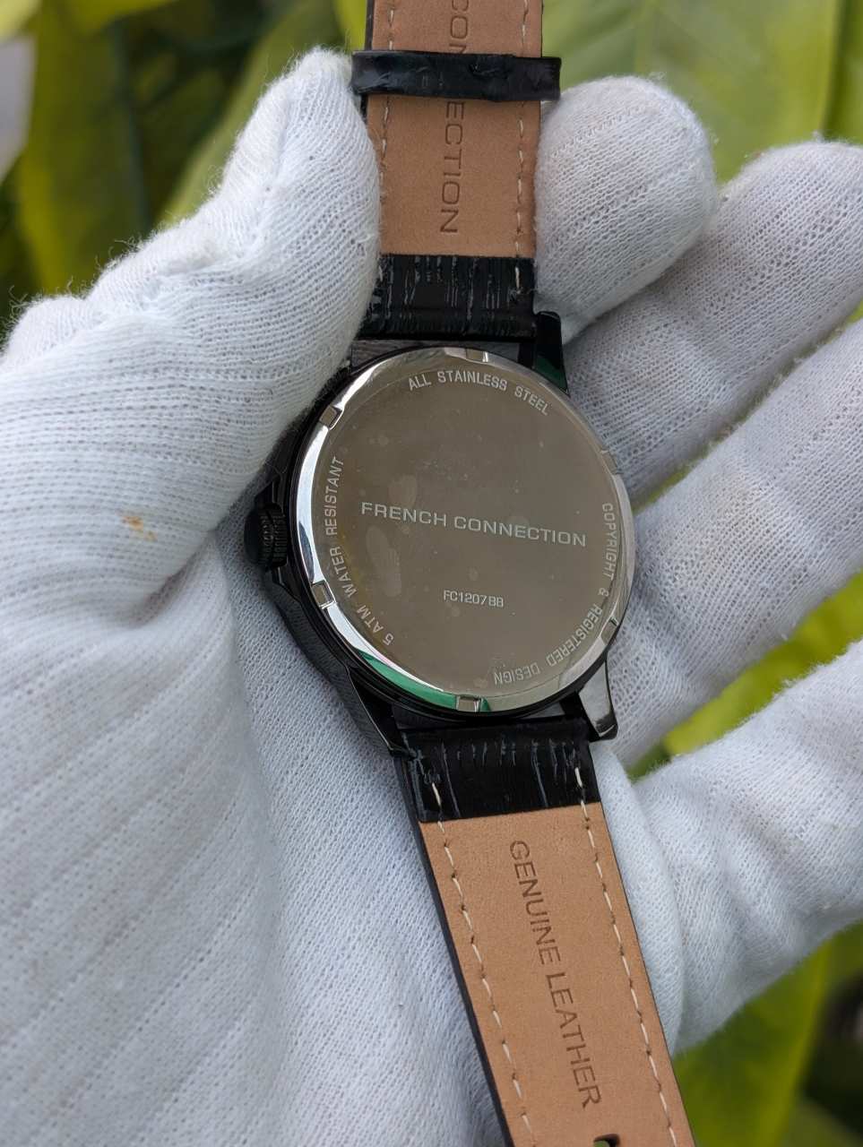 This French Connection men’s analog quartz watch features a sleek black dial paired with a black alligator-embossed leather strap, delivering a refined and sophisticated look. Its elegant design makes it ideal for both everyday wear and formal occasions.