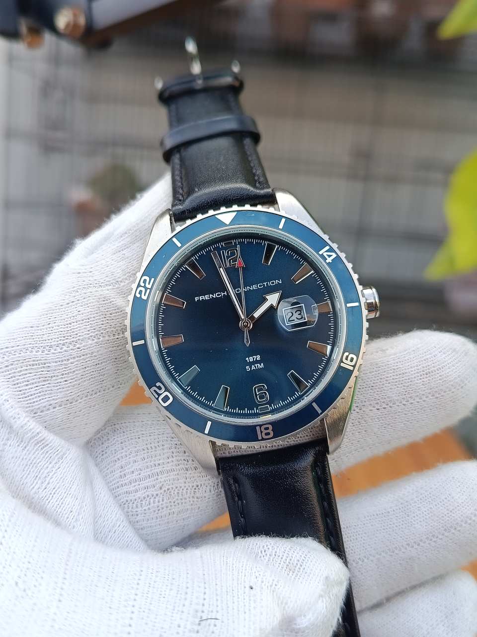 This French Connection men’s analog watch features a rich blue dial housed in a stainless steel case and paired with a black leather strap. Its refined yet modern design makes it suitable for both everyday wear and smart casual styling.