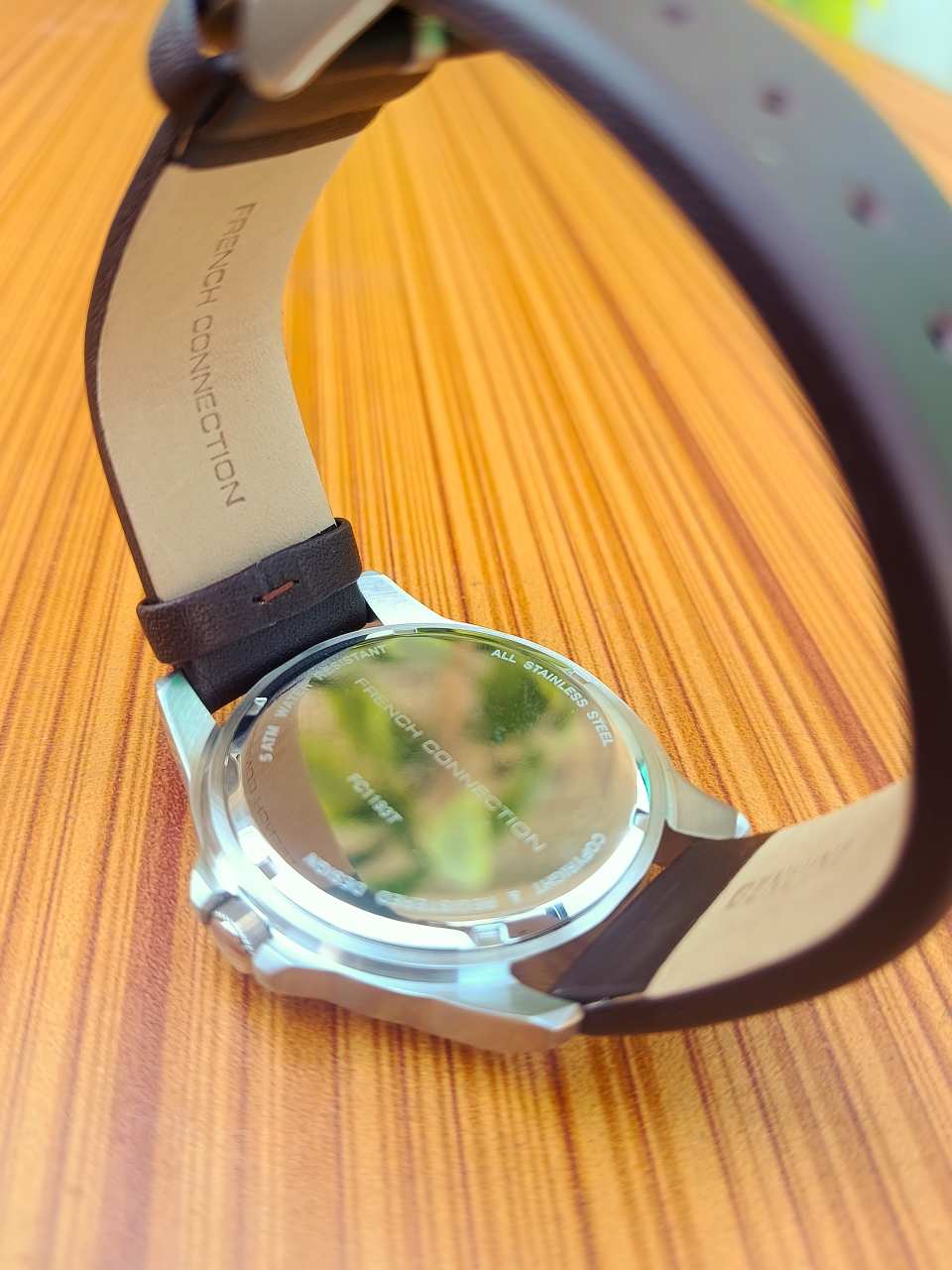 This French Connection men’s analog watch features a refined gold-tone case paired with a classic brown leather strap, delivering an elegant and timeless look. Perfect for formal occasions as well as everyday wear.