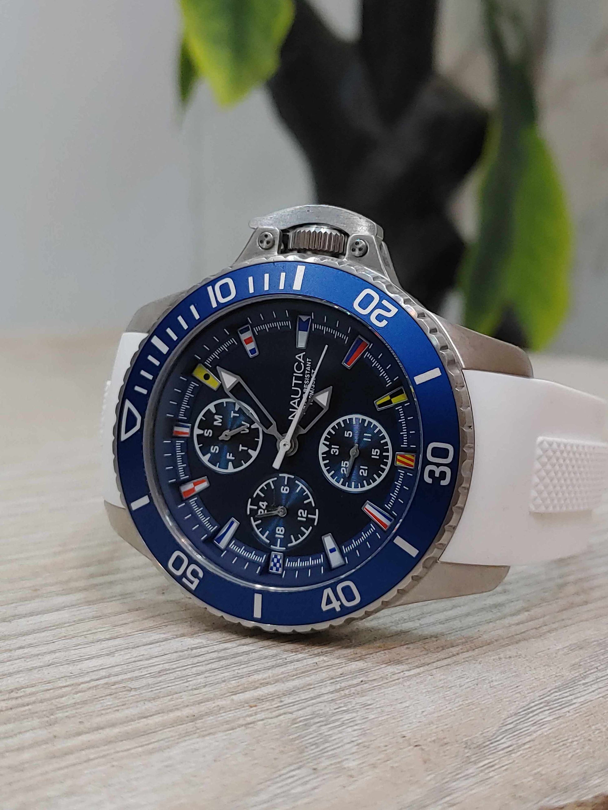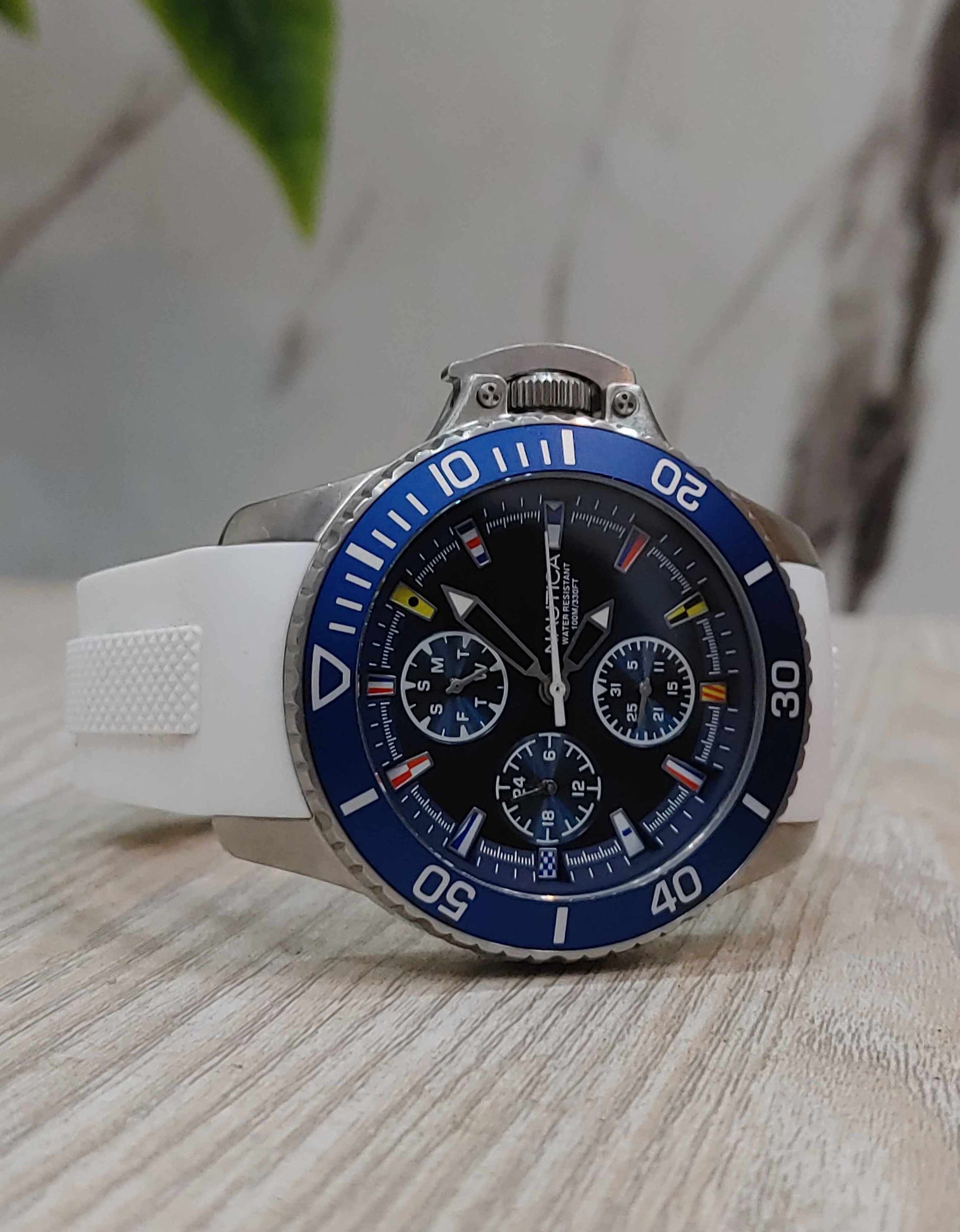 Nautica White Rubber Strap Chronograph Special Flag Edition Watch For Men Jaoan Quartz Movement 42mm Case diameter 100% Authentic watch like Brand New.