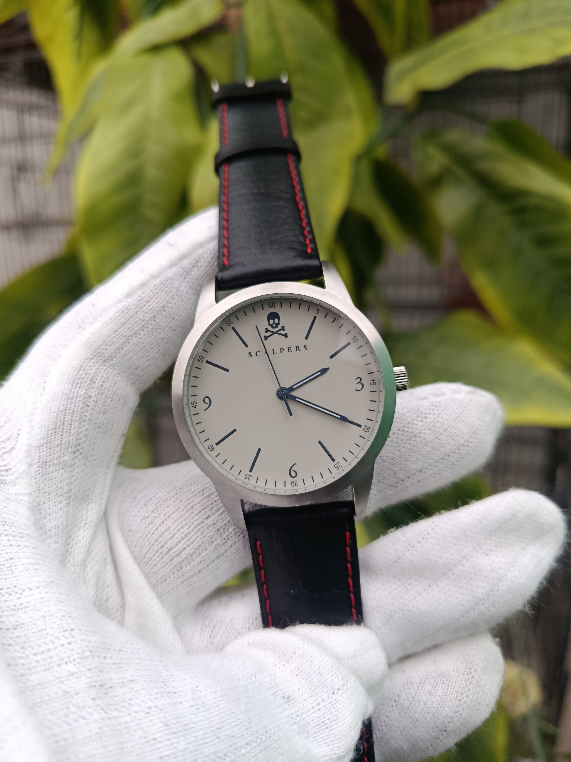 This Scalpers men’s watch stands out with a clean white dial featuring the brand’s signature skull logo, paired with a black leather strap highlighted by red stitching. The bold contrast adds character while maintaining an elegant and modern look, making it suitable for both casual and smart-casual wear.