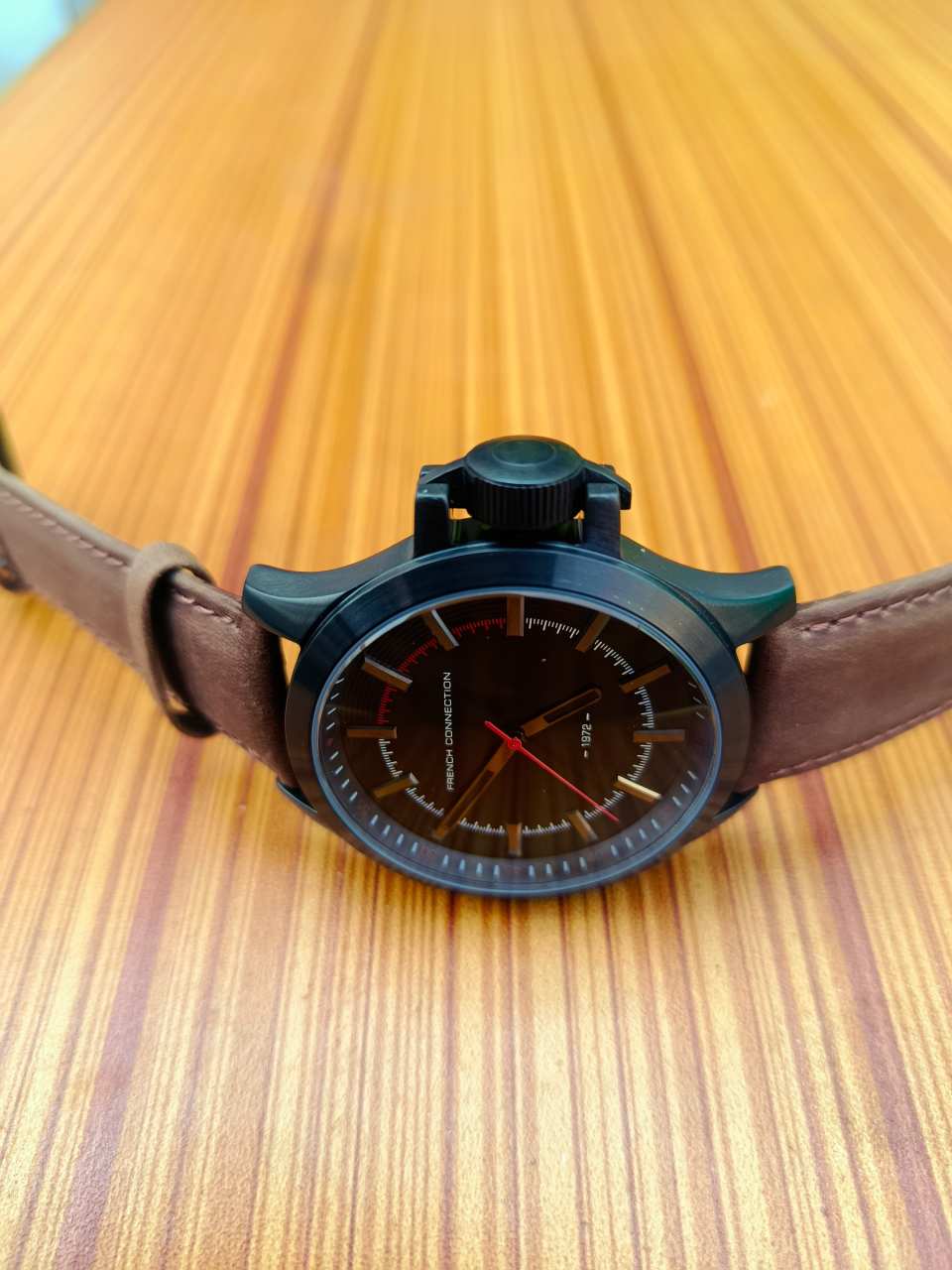 French Connection FC1240TB analog watch for men with a black dial and brown leather strap.